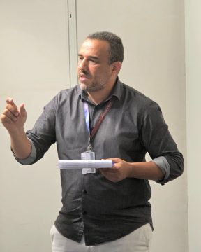 “Segurança no trabalho é lei e deve ser cumprida, mas conversar sobre o tema aumenta a conscientização do profissional e amplia nossa capacidade de prevenir acidentes com os trabalhadores, diretamente, e com toda a comunidade que circula nos ambientes nos quais as equipes estão atuando”, afirma Douglas de Santana Correa, técnico de segurança do trabalho (DH/SESMT) responsável pelo encontro deste dia 23/3, na sede das oficinas (campus Monte Alegre da PUC-SP).